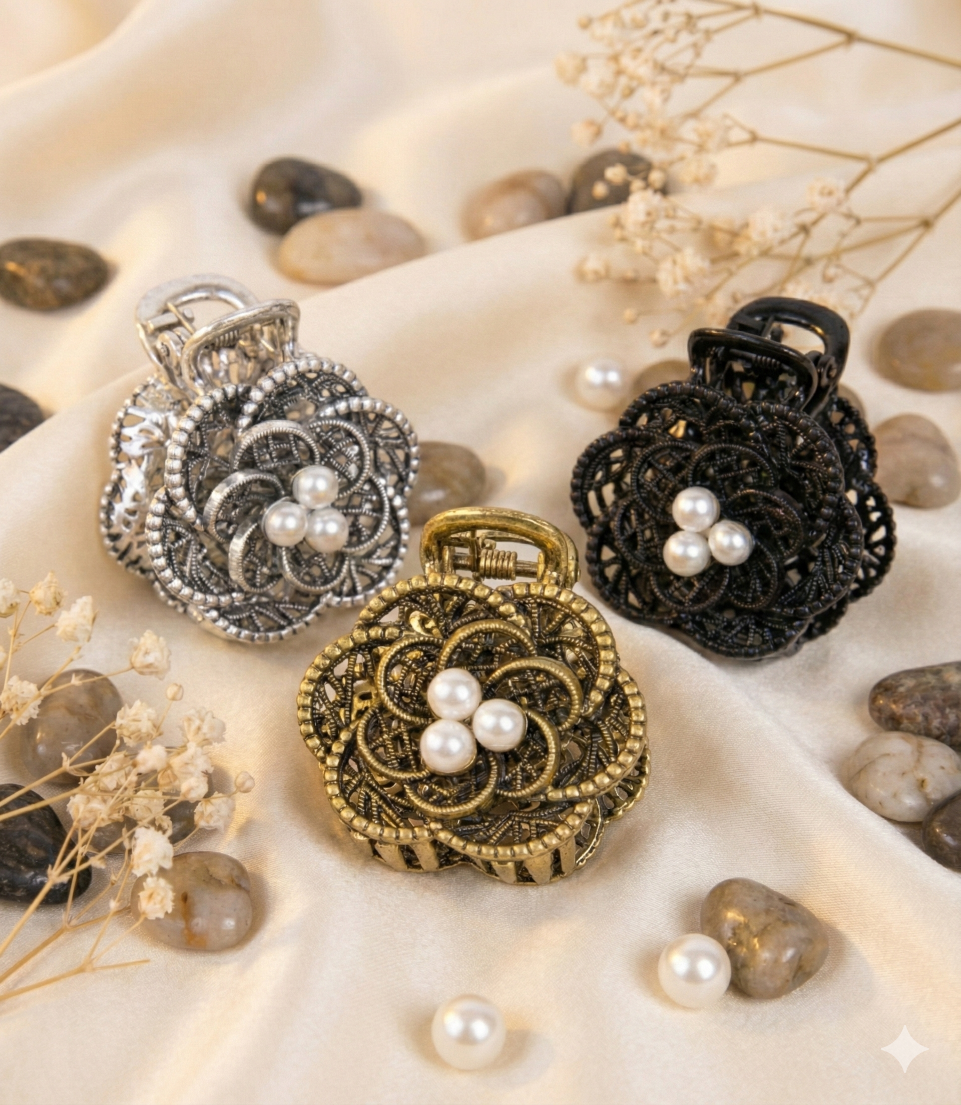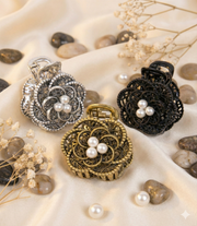 Radhu & Kabby Metal Floral Hair Claw Clip | Black, Silver & Gold Vintage Style Mini Claw Clips with White Pearl