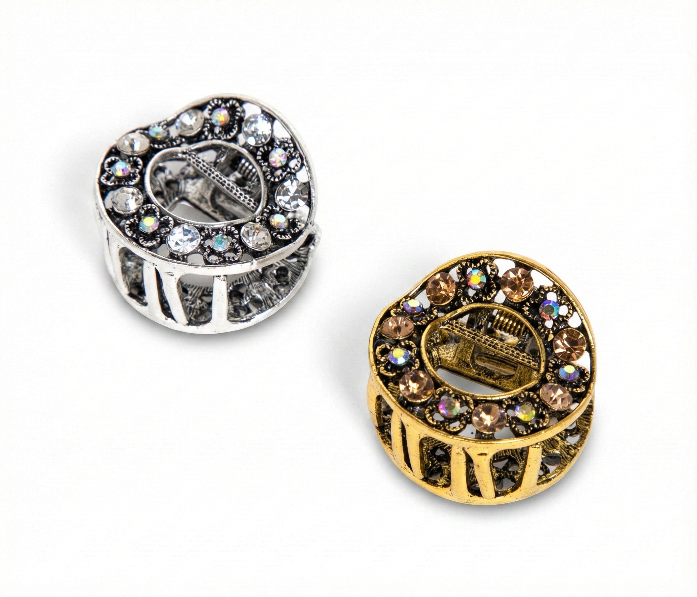 Radhu & Kabby Metal Round Stone Hair Claw Clip Set | Silver & Gold Strong Grip Vintage Rhinestone Hair Accessories