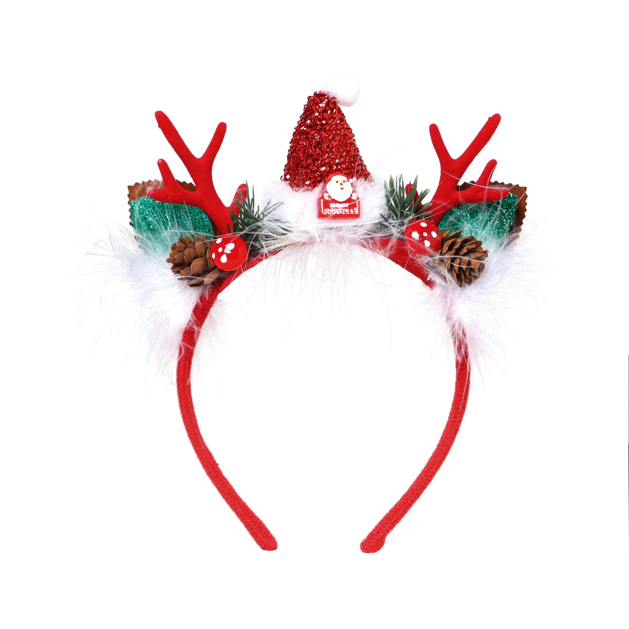 Radhu & Kabby Christmas Reindeer Headband | Festive Antlers with Santa Hat, Pinecones & Glitter Decor | Soft, Lightweight & Comfortable Hairband