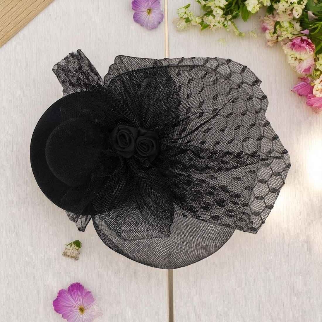 Radhu & Kabby Black Fascinator Hat with Hexagonal Mesh Veil Bow and Roses | Two Alligator Clips for Grip